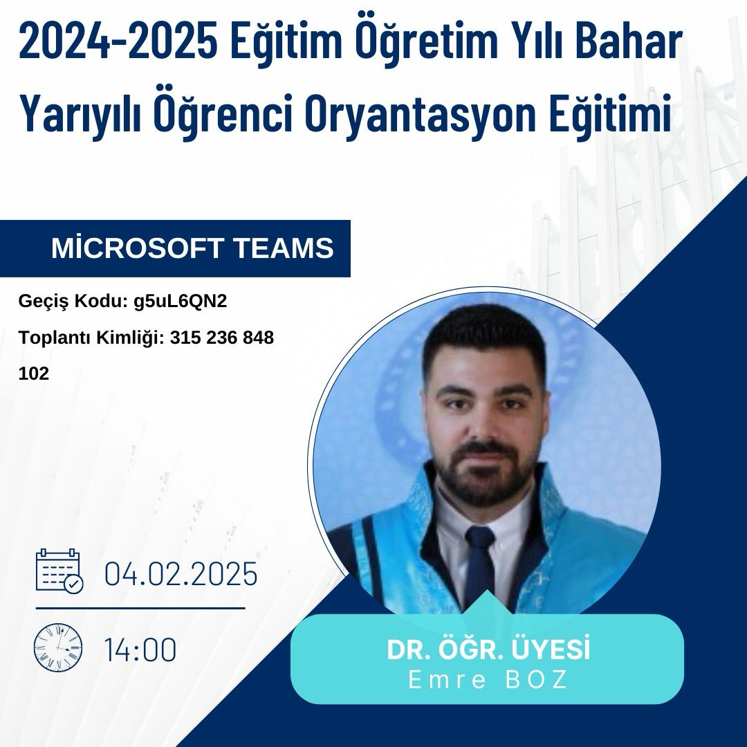 Lisansüstü Eğitim Enstitüsü Oryantasyon Eğitimi Gerçekleştirdik. Bayburt Üniversitesi Lisansüstü Eğitim Enstitüsü, 2024-2025 Eğitim Öğretim Yılı Bahar Yarıyılında kayıt yaptıran Yüksek Lisans ve Doktora öğrencilerine yönelik Oryantasyon Müdür Yardımcımız Dr. Öğr. Üyesi Emre Boz tarafından Eğitimi verildi.