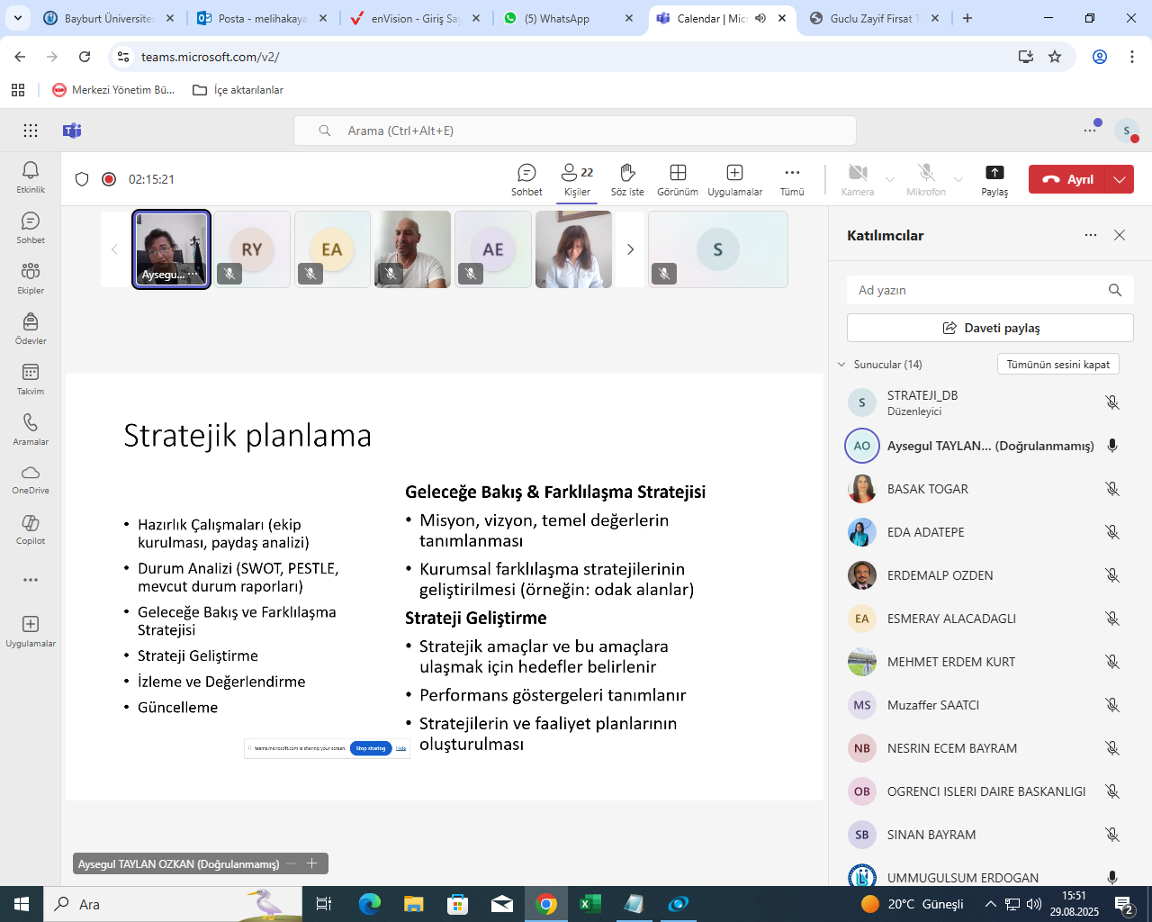 2027-2031 Dönemini Stratejik Plan Çalışmaları Kapsamında YÖKAK Denetçisi ve Uluslararası Kıbrıs Üniversitesi Tıp Fakültesi Dekanı Prof. Dr. Hikmet Ayşegül TAYLAN ÖZKAN tarafından, Stratejik Planlama Ekibi ve Alt Çalışma Gruplarına yönelik olarak 29.08.2025 tarihinde, saat 15.30-16.30 saatleri arasında online "Stratejik Plan Hazırlanmasında Dikkat edilecek Hususlar" ile ilgili eğitim verilmiştir.