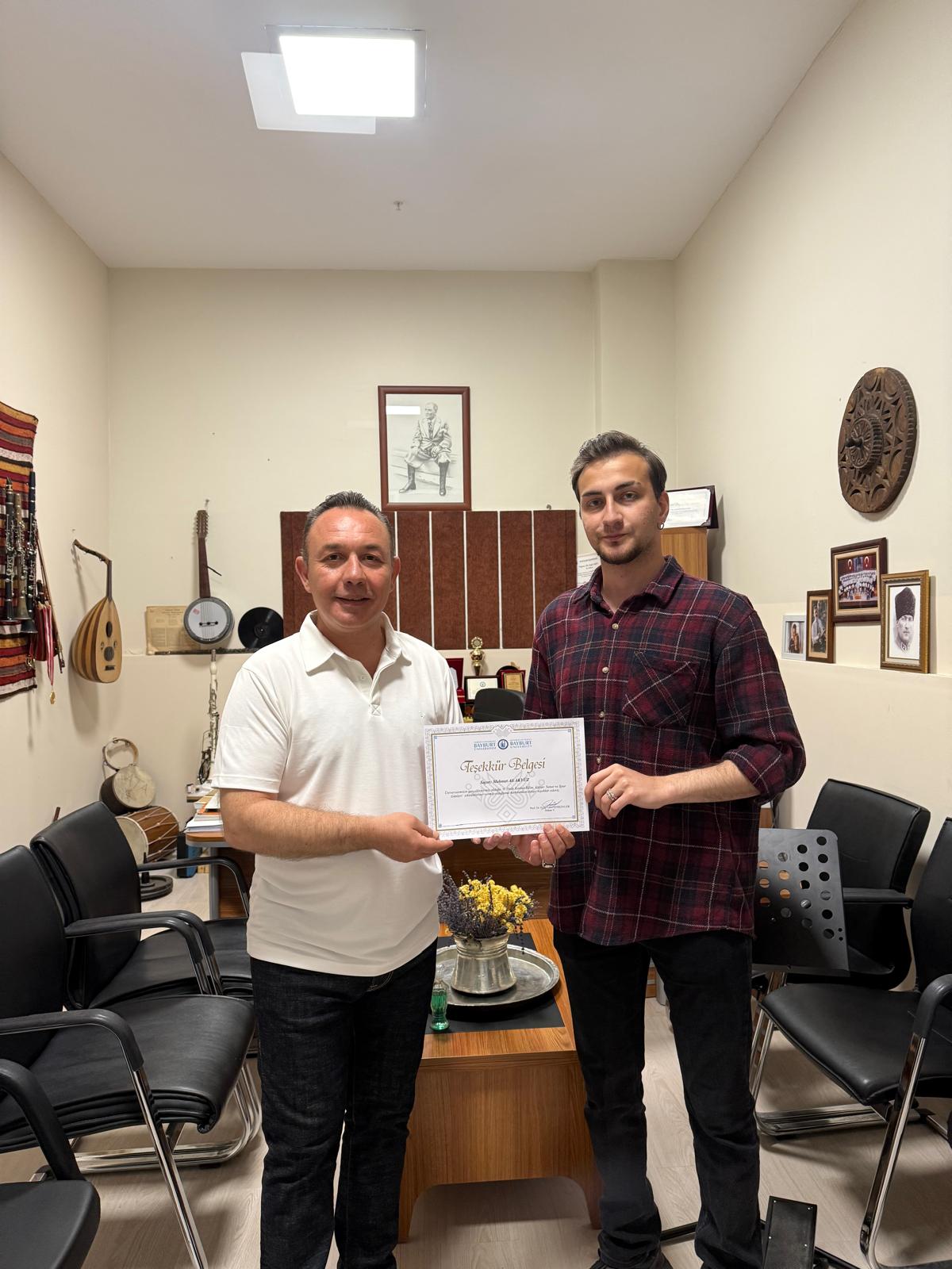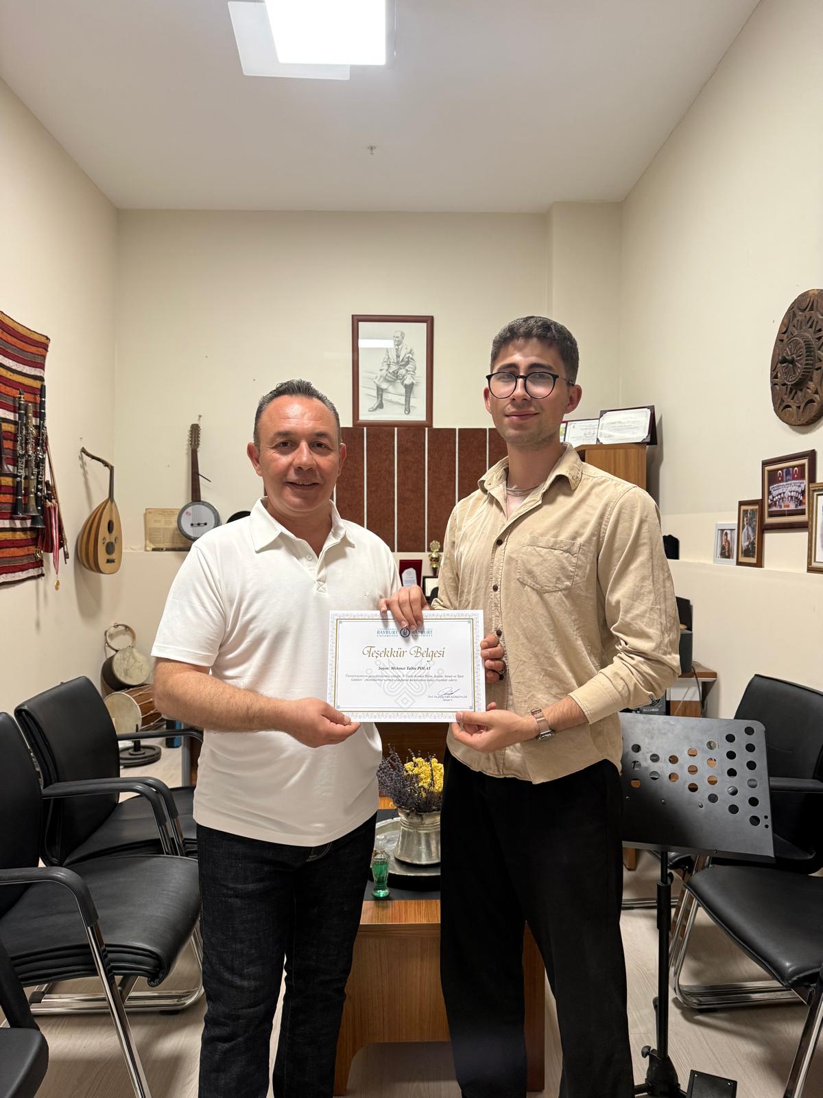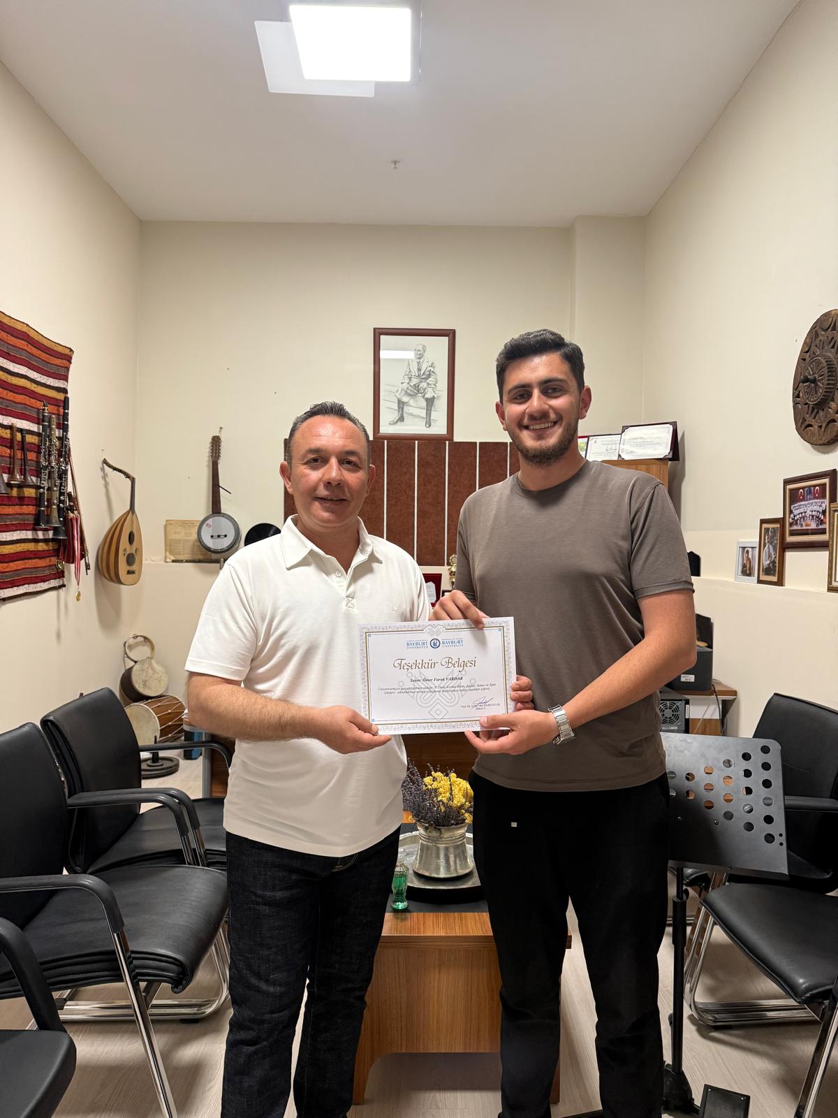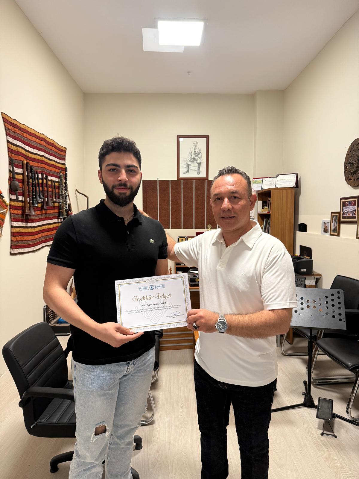 8. Dede Korkut Bilim, Kültür, Sanat ve Spor Etkinlikleri Kapsamında ön grup olarak mezuniyet konserinde sahne alan bölüm öğrencilerimiz Ömer Faruk VARDAR, Mehmet Ali AKYÜZ, Mehmet Talha POLAT, Tuğrul Berkay AKYÜZ ve Doğukan BÜTÜNER'e ödülleri Dekan Yardımcısı ve Müzik Bölümü Başkadı Dr. Öğr. Üyesi Zafer EREN tarafından verildi.