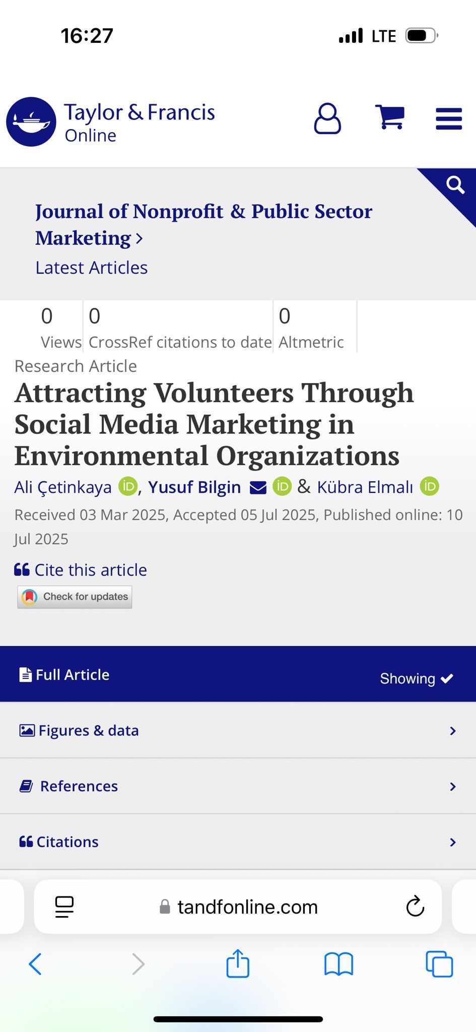 Fakültemiz öğretim üyelerinden ve aynı zamanda Rektör Yardımcımız Prof. Dr. Yusuf BİLGİN ile Dr. Öğr. Üyesi Kübra ELMALI’nın ortak çalışması “Attracting Volunteers Through Social Media Marketing in Environmental Organizations” başlıklı makale, Q2 kategorisinde yer alan Journal of Nonprofit & Public Sector Marketing dergisinde yayımlanmıştır. 📚✨