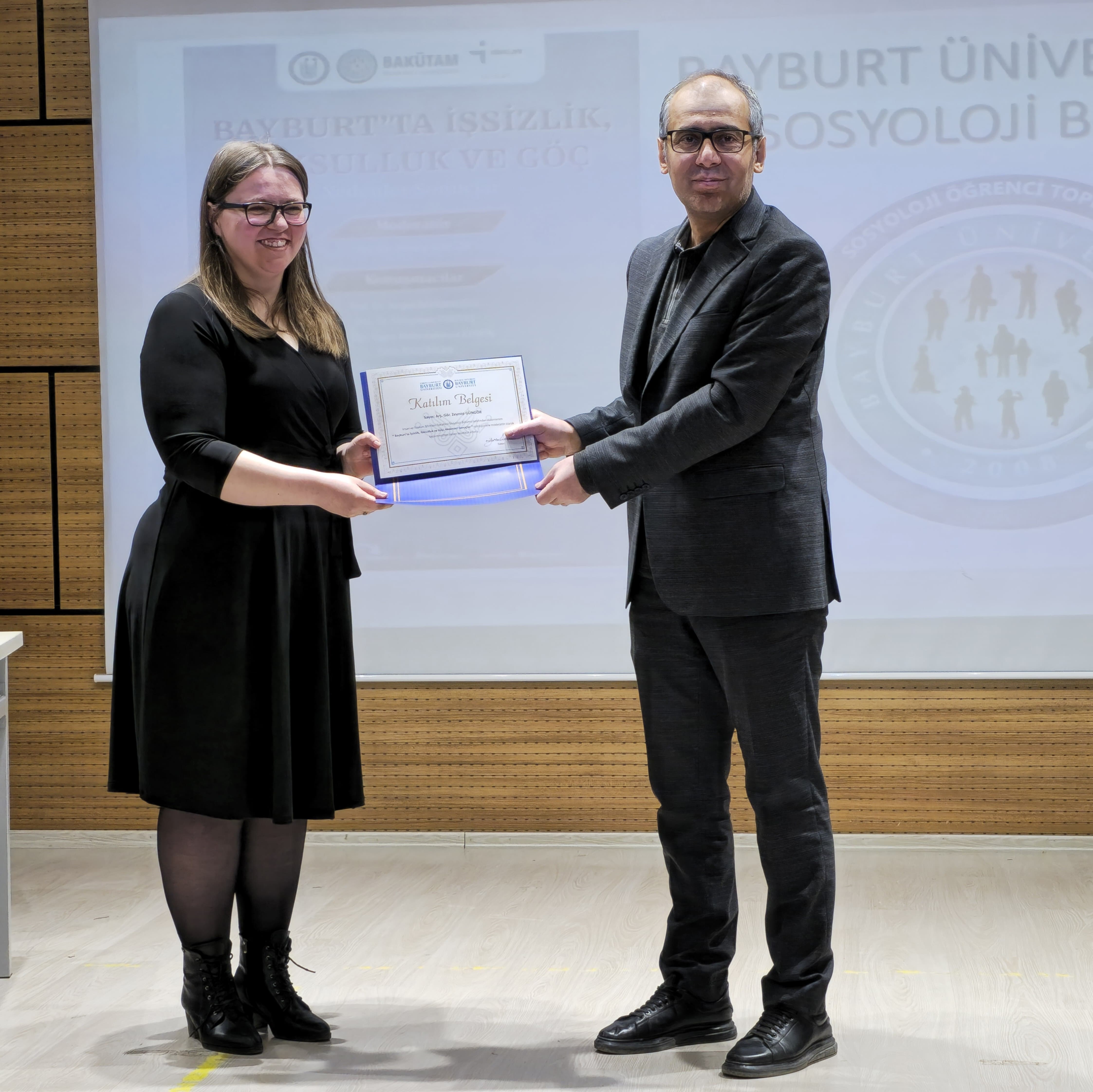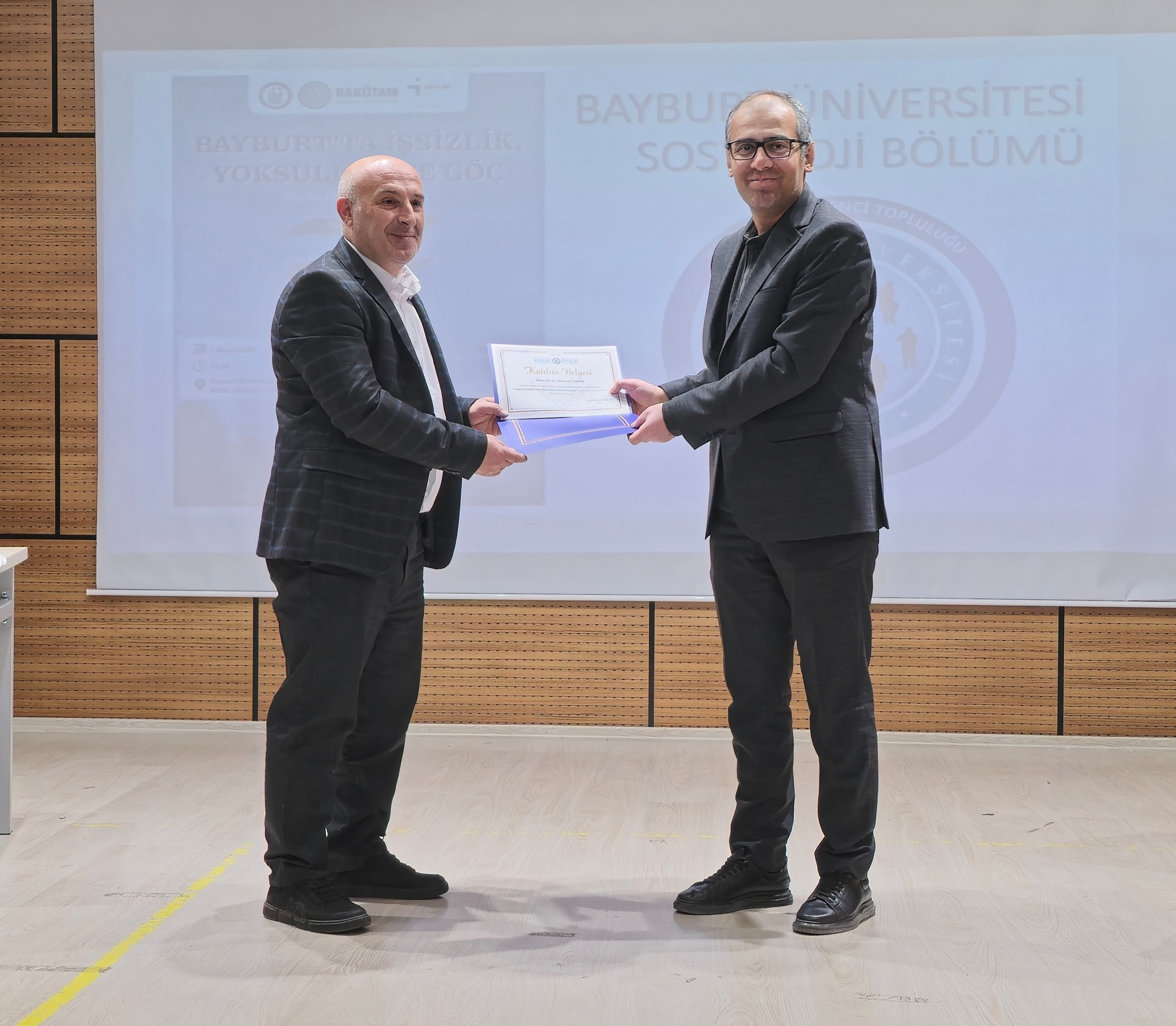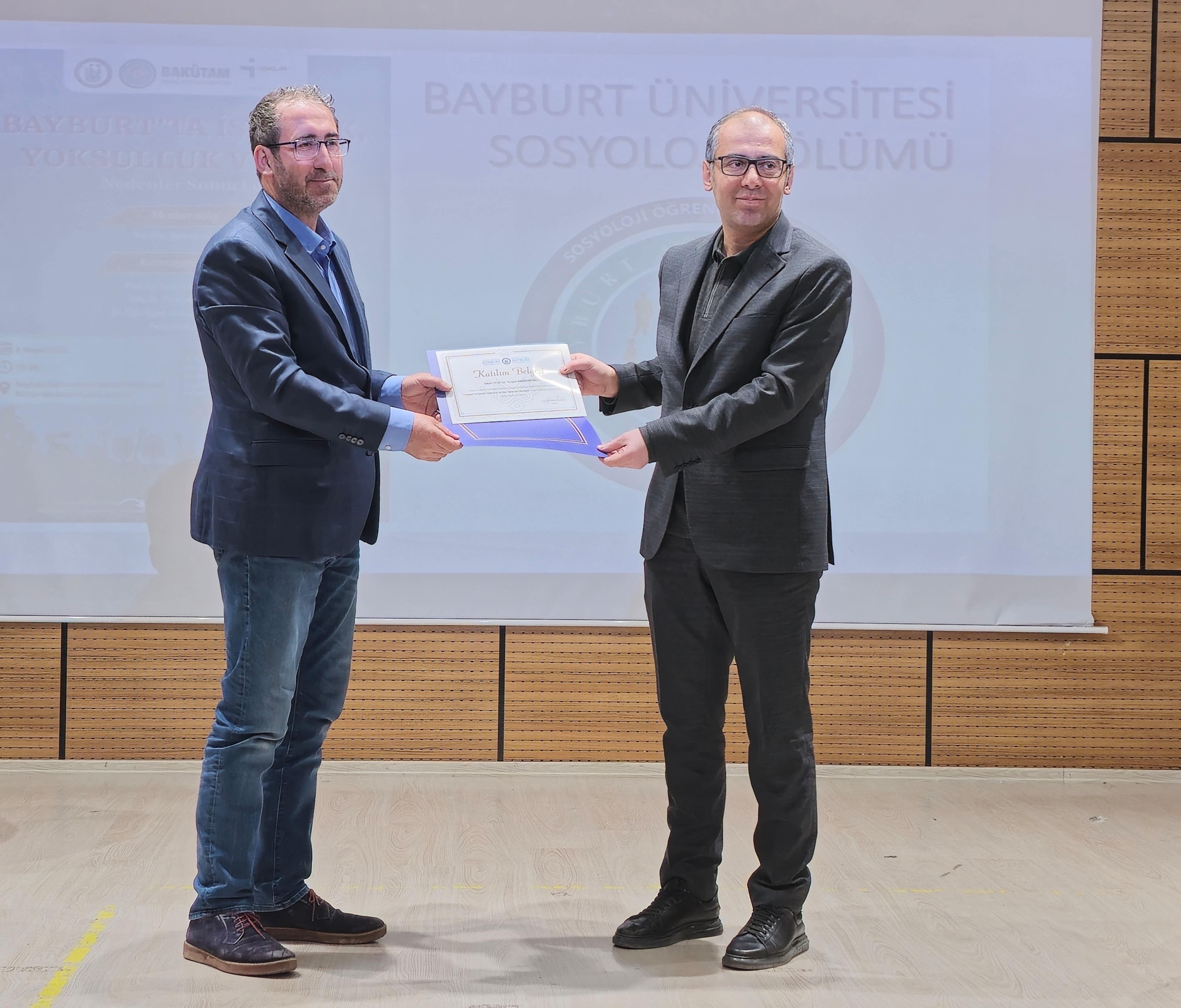 Fakültemiz Sosyoloji Bölümü, Sosyoloji Öğrenci Topluluğu ve BAKÜTAM işbirliği ile hazırlanan panel; Arş. Gör. Zeynep GÜNGÖR moderatörlüğünde Prof. Dr. Turgut BAYRAMOĞLU, Doç. Dr. Süleyman YURTTAŞ, Dr. Öğr. Üyesi Abdurrahman KESKİN ve İŞKUR İl Müdür Yardımcısı Fatih KILIÇASLAN'ın sunumları ile gerçekleştirildi. Konuşmacılar Bayburt'un sosyo-ekonomik ve kültürel durumu, işsizlik, göç gibi konularda fikirlerini aktararak sorunlarla ilgili çözüm önerileri sunmuşlardır. Program, Fakültemiz dekanı Prof. Dr. Yakup KAHRAMAN'ın katılımcılara teşekkür belgelerini takdim etmesi ile sona ermiştir.