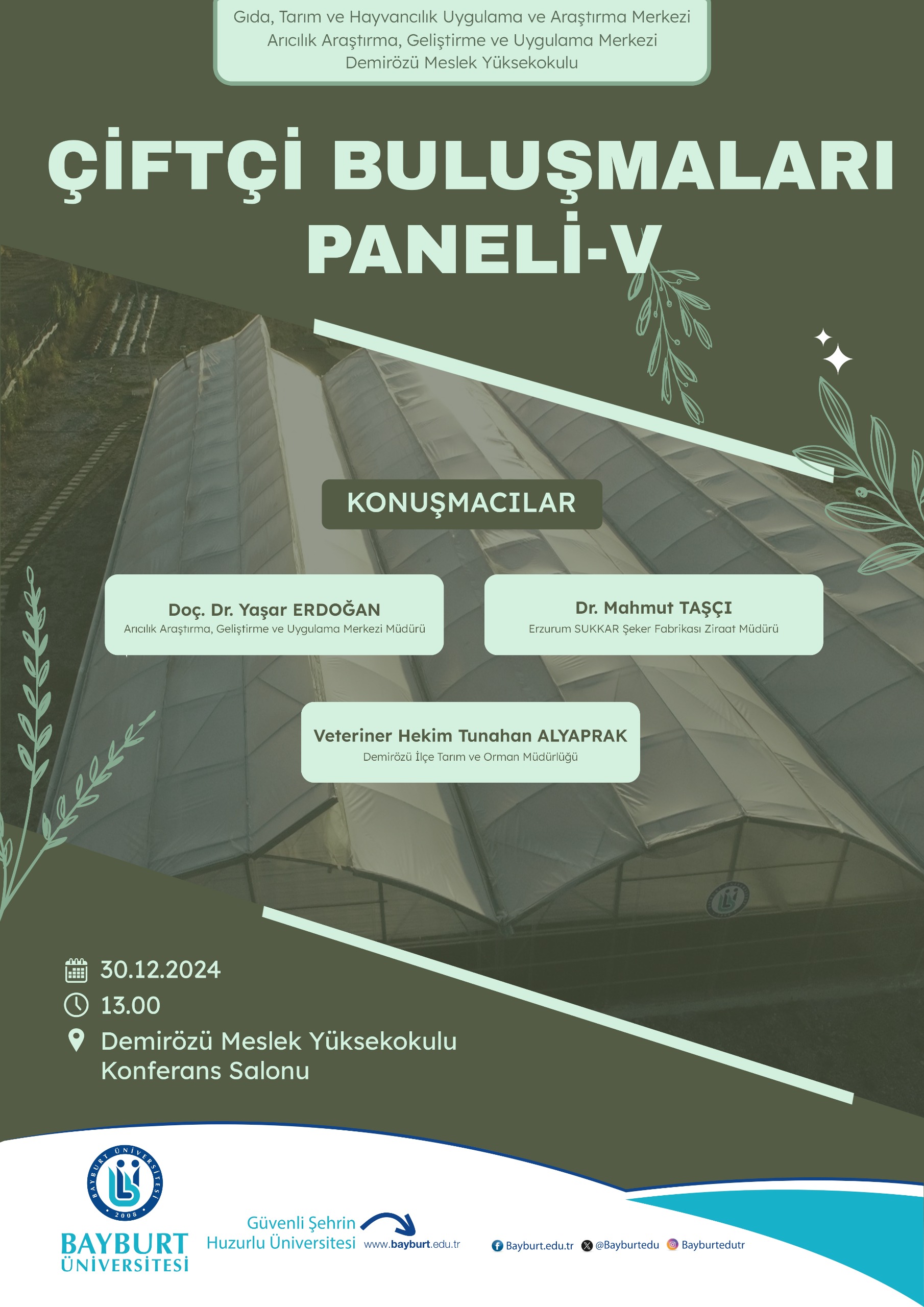 Arıcılık Geliştirme, Uygulama ve Araştırma Merkezi, Gıda Tarım ve Hayvancılık Araştırma Merkezi ve Demirözü Meslek Yüksekokulu işbirliğinde "Çiftçi Buluşmaları V" paneli Demirözü Meslek Yüksekokulu'nda gerçekleştirildi. Çiftçilerin ve öğrencilerin yoğun ilgi ve katılımları ile gerçekleştirilen panelde; Erzurum SUKKAR Şeker Fabrikası Ziraat Müdürü Dr. Mahmut TAŞÇI "Şeker Pancarı Yetiştiriciliğinin Yenilikçi Tarımsal Üretime Katkısı", Demirözü İlçe Tarım ve Orman Müdürlüğü'nden Veteriner Hekim Tunahan ALYAPRAK "Sığırlarda Zatürre (Pnömoni) Hastalığı" ve Meslek Yüksekokulumuz ve aynı zamanda Arıcılık Araştırma Merkezi Müdürü Doç. Dr. Yaşar ERDOĞAN "Bal Arısı Kolonilerinde Varroa ile Mücadele" konulu sunularını gerçekleştirmiştir. Katılımcıların ilgiyle takip ettiği sunumlardan sonra soru-cevap bölümü gerçekleştirilmiş olup akabinde panelistlere teşekkür belgelerinin takdimi ile etkinlik sona ermiştir.
