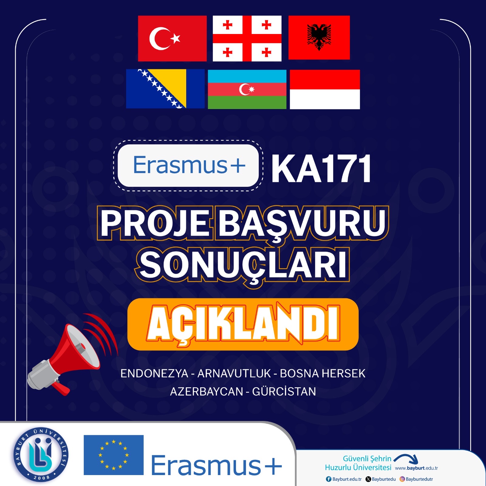 Üniversitemizin 2025 yılı Erasmus+ KA171 projeleri kapsamında yaptığı başvurular kabul edildi. Endonezya, Arnavutluk, Bosna Hersek, Azerbaycan ve Gürcistan gibi ülkelerle kurulan akademik ortaklıklar sayesinde hem öğrenci hem personel hareketliliği alanında önemli fırsatlar doğdu.