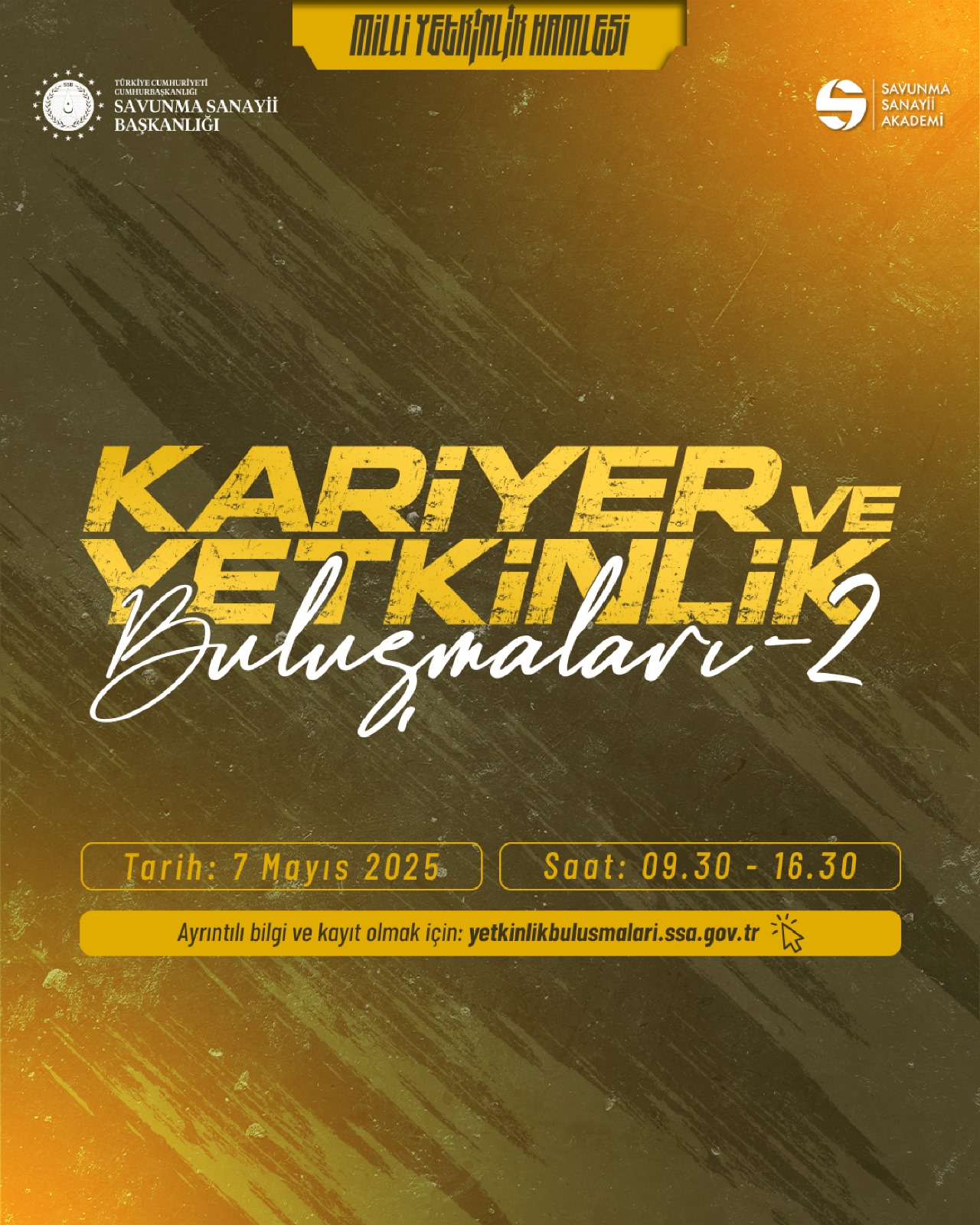 T.C. Cumhurbaşkanlığı Savunma Sanayii Başkanlığı tarafından yürütülen ve ülkemizin teknolojik yetkinliğini artırmayı hedefleyen Millî Yetkinlik Hamlesi Projesi kapsamında hayata geçirilen “Kariyer ve Yetkinlik Buluşmaları” etkinliğinin ikincisi, 7 Mayıs 2025 tarihinde çevrim içi olarak gerçekleştirilecektir.