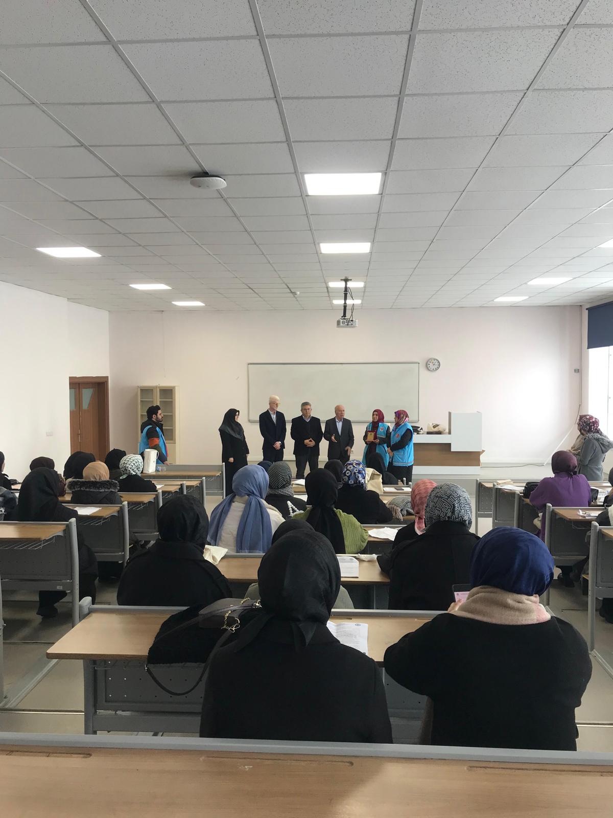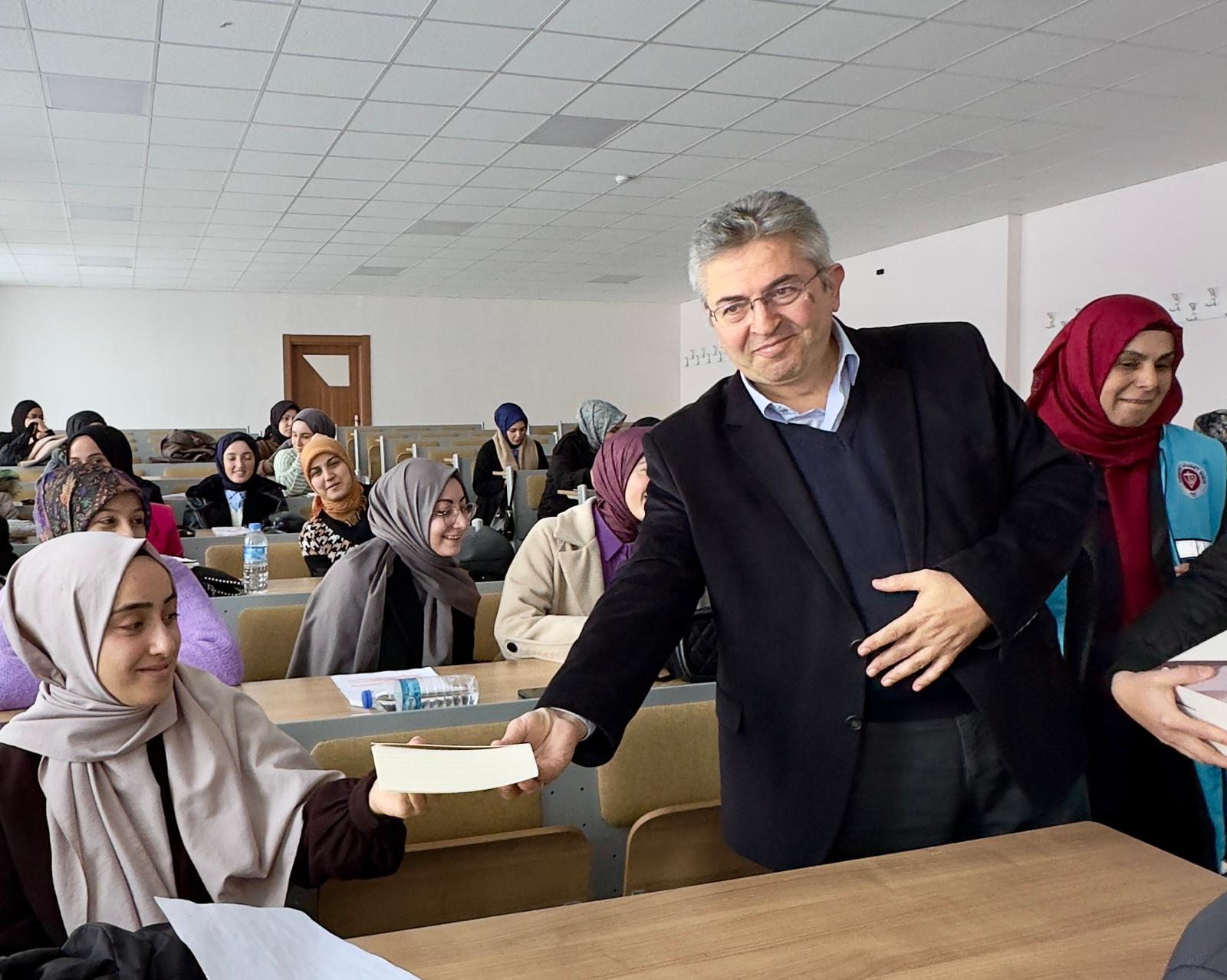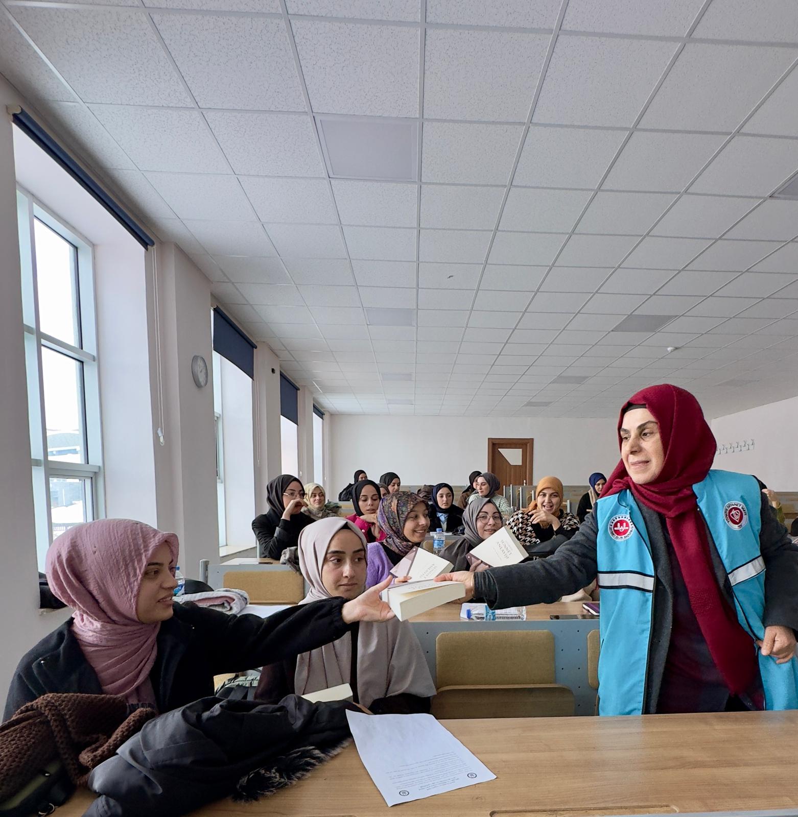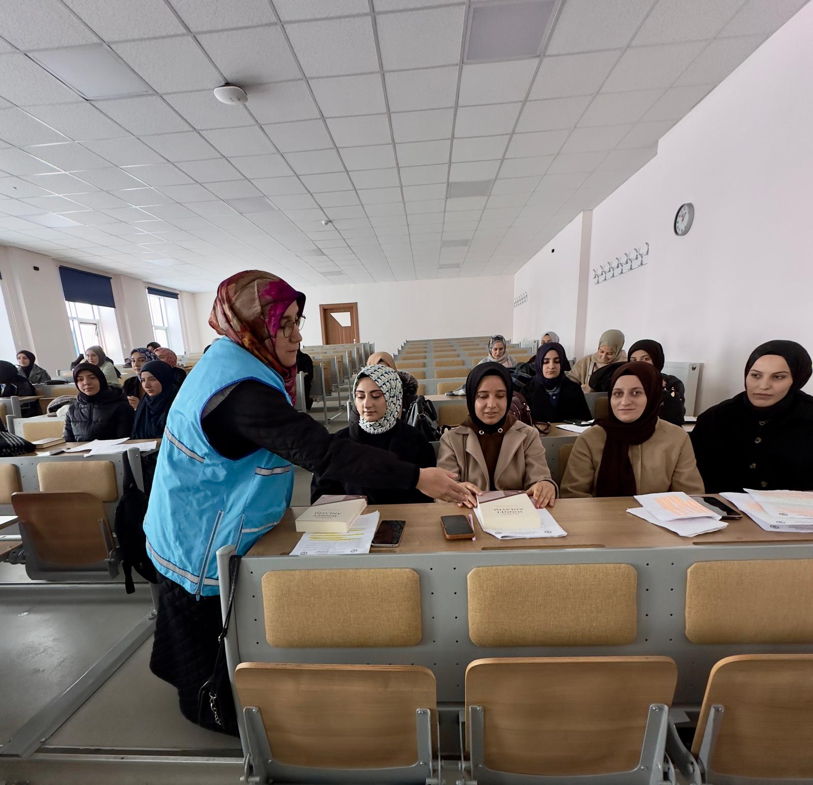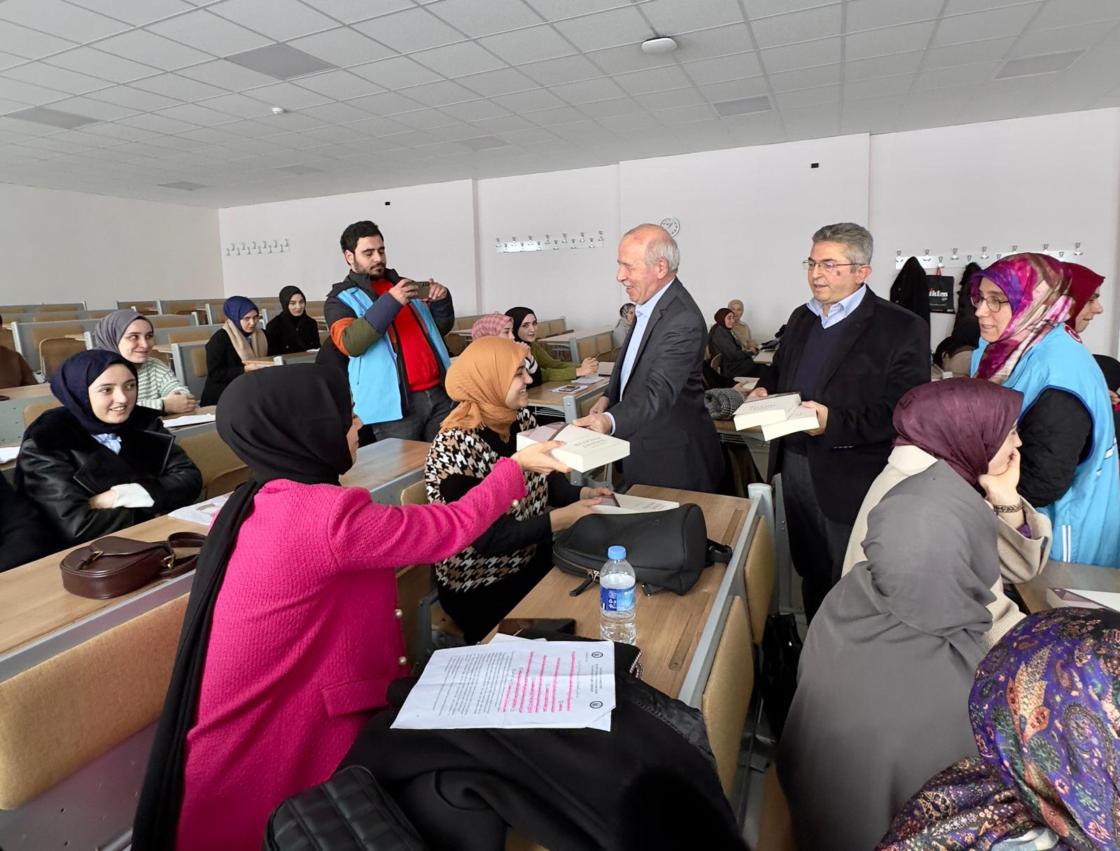 - İlahiyat Fakültesi Dekanı Prof. Dr. Davut Yaylalı, Siyer Araştırmaları Öğrenci Topluluğu Danışmanı Doç. Dr. Abdurrahman Okuyan, TDV Trabzon Kadın Kolları Başkanı Lütfiye BAYRAKTAR ve Trabzon İl Vaizesi Nagihan CİHAN’ın kısa konuşmalarının ardından TDV gönüllüsü Aysel Kahvecioğlu ve Taceddin Bayraktar öğrencilerimize kitap takdim etti.