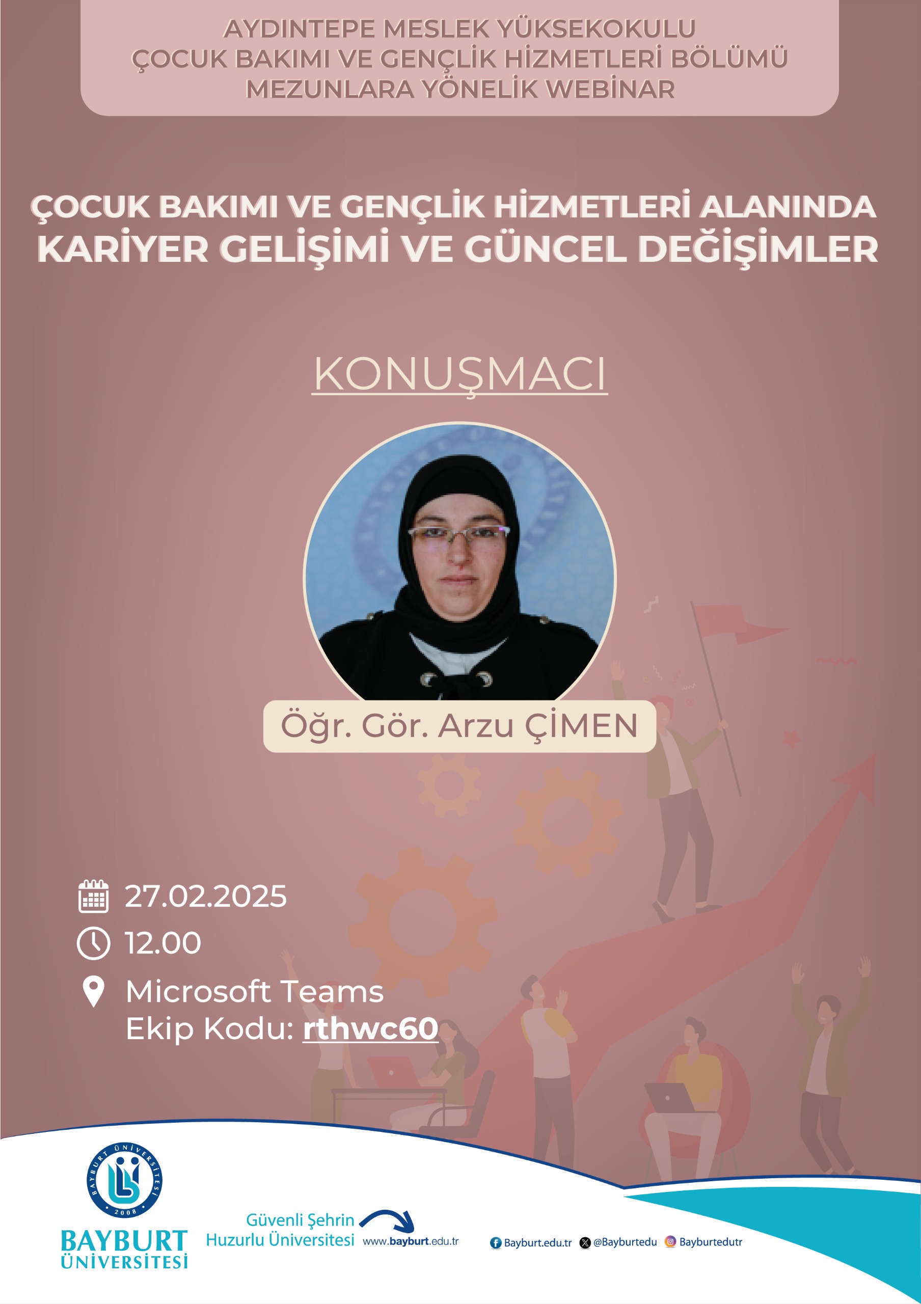 Mezun öğrencilerimizin kariyer gelişimlerine katkı sunmak ve alandaki değişimleri takip etmek için Öğr. Gör. Arzu ÇİMEN tarafından 27 Şubat 2025 saat 12.00'da “Çocuk Bakımı ve Gençlik Hizmetleri Alanında Kariyer Gelişimi ve Güncel Değişimler” başlığı altında Microsoft Teams üzerinden “rthwc60” giriş koduyla WEBİNAR düzenlenecektir.