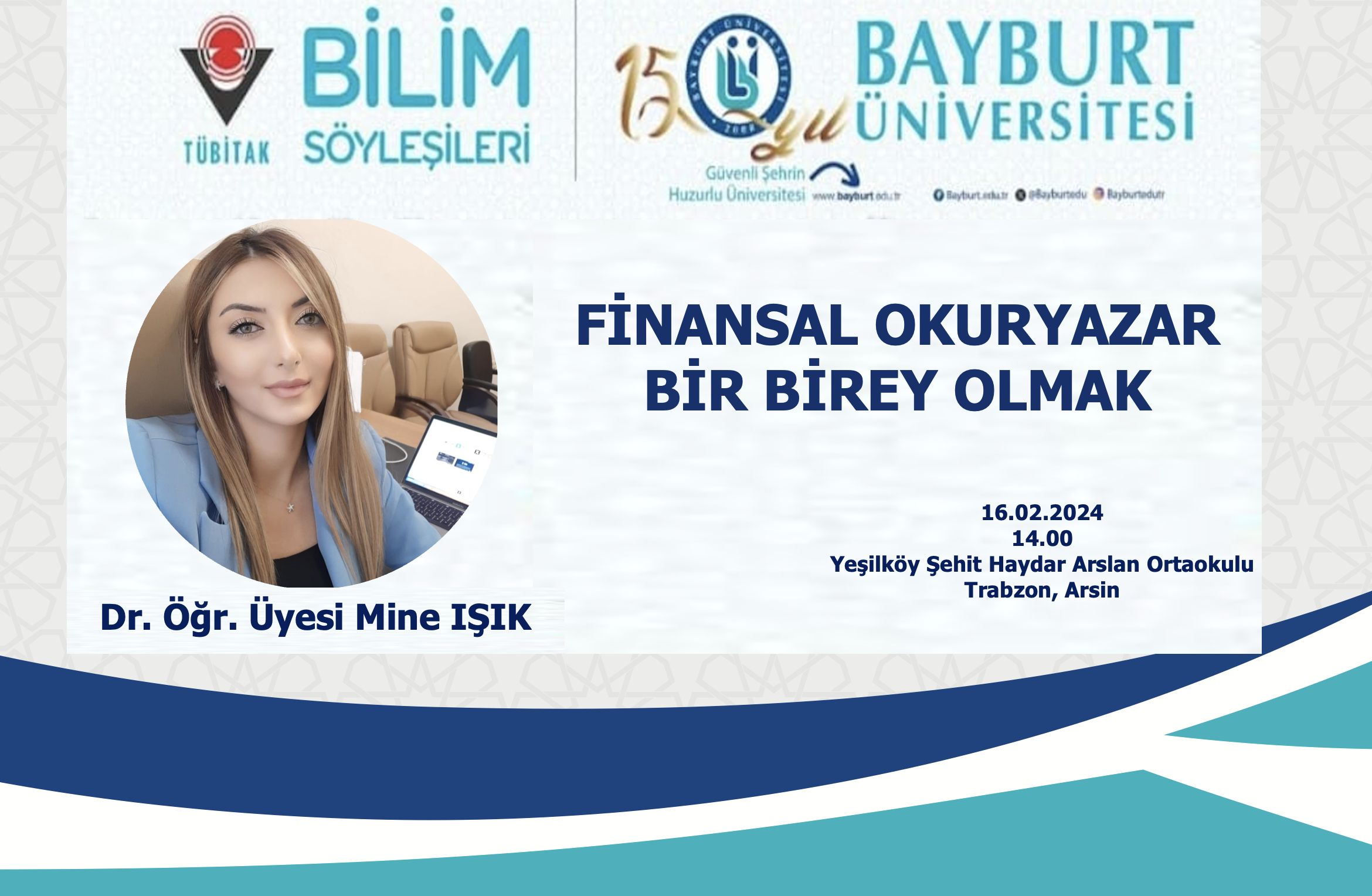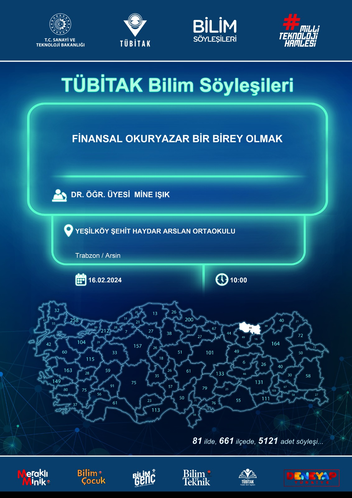 TÜBİTAK Bilim Söyleşileri kapsamında Trabzon, Arsin Yeşilköy Şehit Haydar Arslan Ortaokulu öğrencileri ile buluşan Sosyal Bilimler Meslek Yüksekokulumuz Müdür Yardımcısı Finans, Bankacılık ve Sigortacılık Bölümü öğretim elemanlarından Dr. Öğr. Üyesi Mine IŞIK, "Finansal Okuryazarlık" üzerine söyleşi gerçekleştirdi. Öğrencilerde finansal okuryazarlığa ilişkin bir bilinç ve farkındalık oluşturmayı amaçlayan söyleşiye büyük bir ilgiyle katılım sağlandı. Somut örneklerle, soru cevap yoluyla öğrencilerin söyleşiye interaktif bir şekilde aktif katılımının sağlanmasıyla gerçekleşen söyleşi sonunda Dr. Öğr. Üyesi Mine IŞIK, “Söyleşiye katılan İlçe Milli Eğitim Müdürü Sn. Yavuz ÜSTÜNDAĞ'a, söyleşiye büyük bir ilgi ile ev sahipliği yapan Yeşilköy Şehit Haydar Arslan Ortaokulu idarecileri, öğretmenleri ile öğrencilerine ve bilim söyleşilerini düzenleyerek bizleri genç nesillerle buluşturan TÜBİTAK'a teşekkürlerimi arz ediyorum.” dedi.
