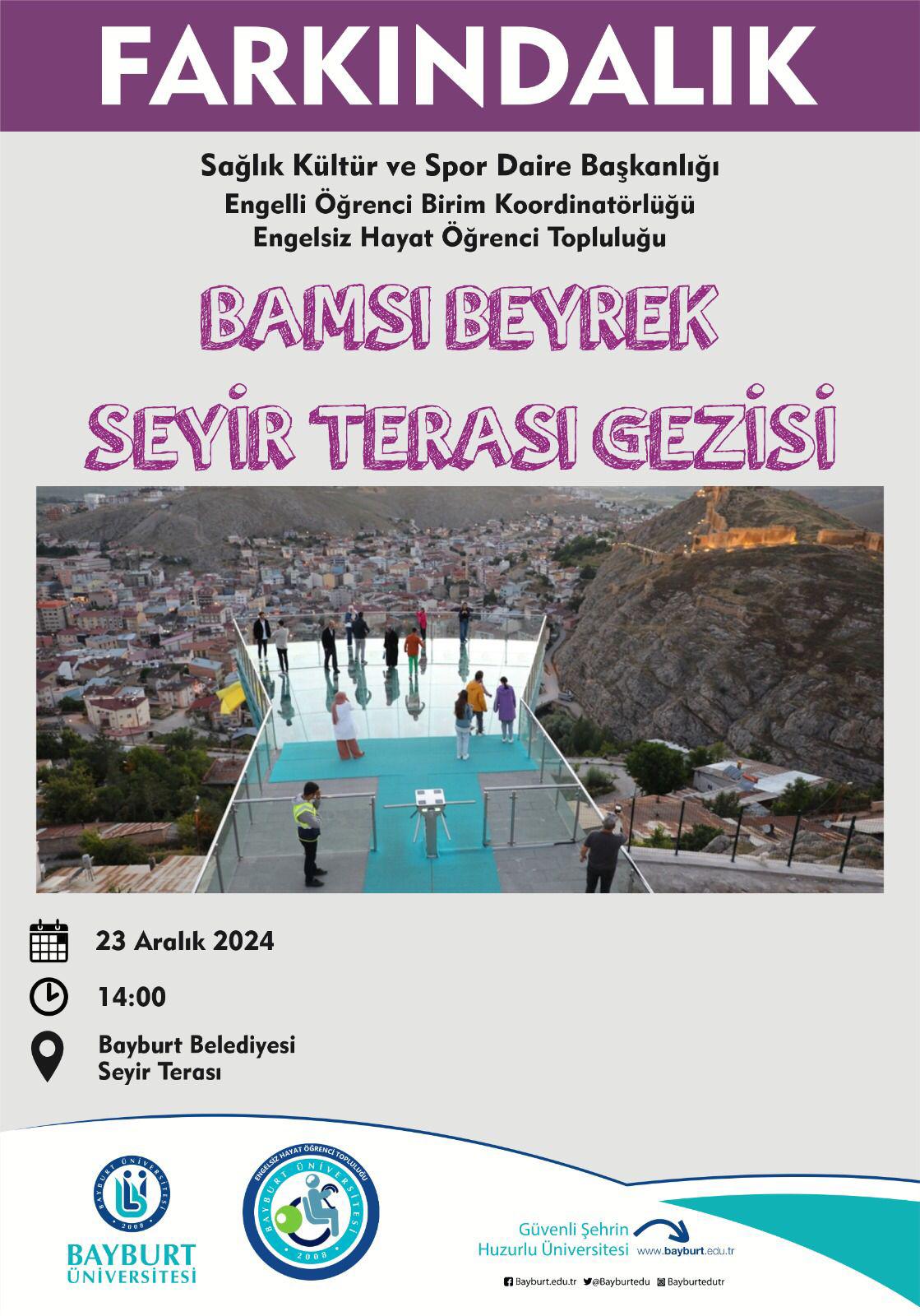 Bayburt Üniversitesi Sağlık Kültür ve Spor Daire Başkanlığı, Engelsiz Hayat Öğrenci Topluluğu ve koordinatörlüğümüzün iş birliği ile düzenlenen Bamsı Beyrek Seyir Terası Gezisi Engelli Öğrenci Birim Koordinatörü Doç. Dr. Abdurrahman OKUYAN, Koordinatör Yardımcıları Arş. Gör. Fatma Semiha AYDEMİR ve Öğr. Gör. Ceren ARI ARAT, birim personeli Fatma KÖSE ve Engelsiz Hayat Öğrenci Topluluğu üyesi öğrencilerimizin katılımıyla gerçekleşti.