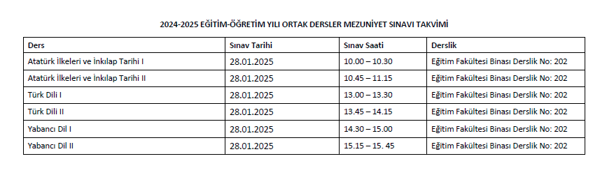 2024-2025 Eğitim Öğretim Yılı Güz Dönemi Ortak Dersler Mezuniyet Sınav Programı
