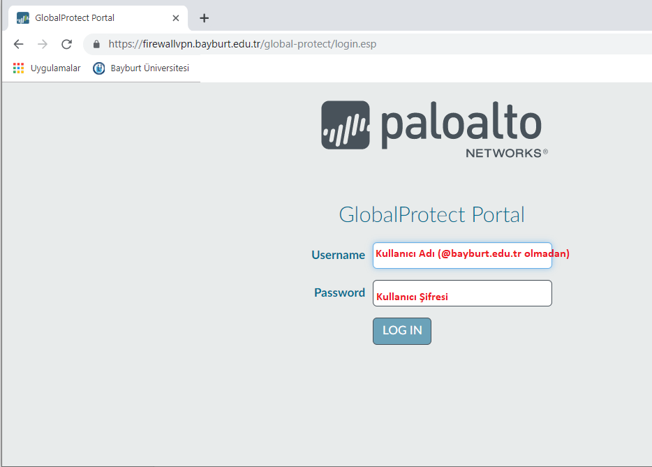 1. Adım: Herhangi bir internet tarayıcısından https://firewallvpn.bayburt.edu.tr adresine giriş yapılır. Gelen ekranda Username ve Password olarak üniversitemizde kullanmakta olduğumuz kullanıcı@bayburt.edu.tr mail adresimizin kullanıcı ve şifresi ekranda görüldüğü gibi girilerek LOG IN tıklanır.