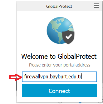 7. Adım: Yükleme tamamlandıktan sonra bilgisayarımızın sol alt köşesinde açılan uygulamaya aşağıdaki resimde görüldüğü gibi “firewallvpn.bayburt.edu.tr “adresi yazılarak Connect tıklanır.