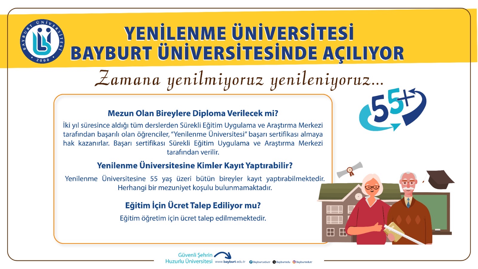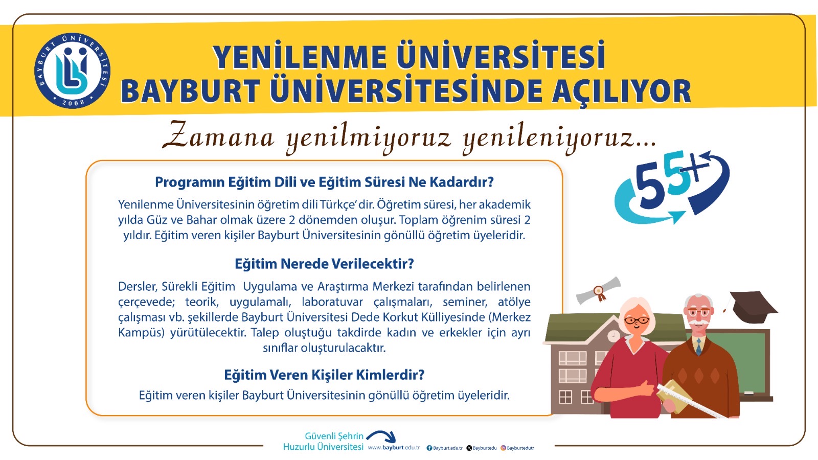 Yenilenme Üniversitesi programı, iki akademik yıl boyunca Güz ve Bahar dönemlerinde devam edecek. Eğitimler Bayburt Üniversitesi Dede Korkut Külliyesi'nde bulunan Sürekli Eğitim Uygulama ve Araştırma Merkezi’nde teorik ve uygulamalı derslerle yürütülecek. Eğitim dili Türkçe olup, eğitimler gönüllü Bayburt Üniversitesi öğretim üyeleri tarafından verilecektir.