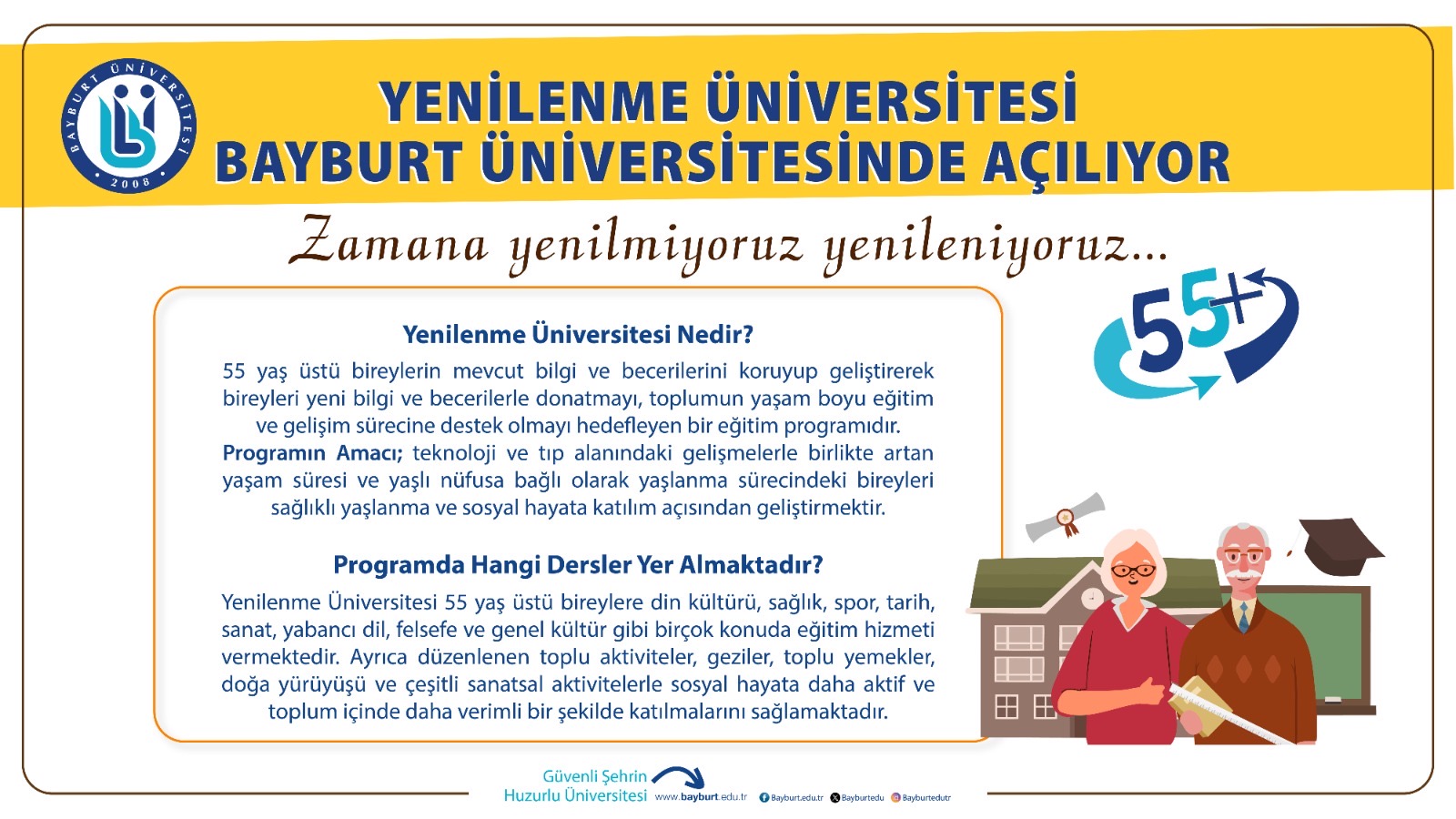 Yenilenme Üniversitesi, yaşlanma sürecindeki bireyleri sosyal hayata daha aktif katılım sağlama ve sağlıklı yaşlanma konusunda bilinçlendirme hedefiyle kurulmuştur. Program, bireylerin hem zihinsel hem de fiziksel olarak aktif kalmalarını destekleyerek onların topluma daha verimli katkılarda bulunmalarını amaçlamaktadır.