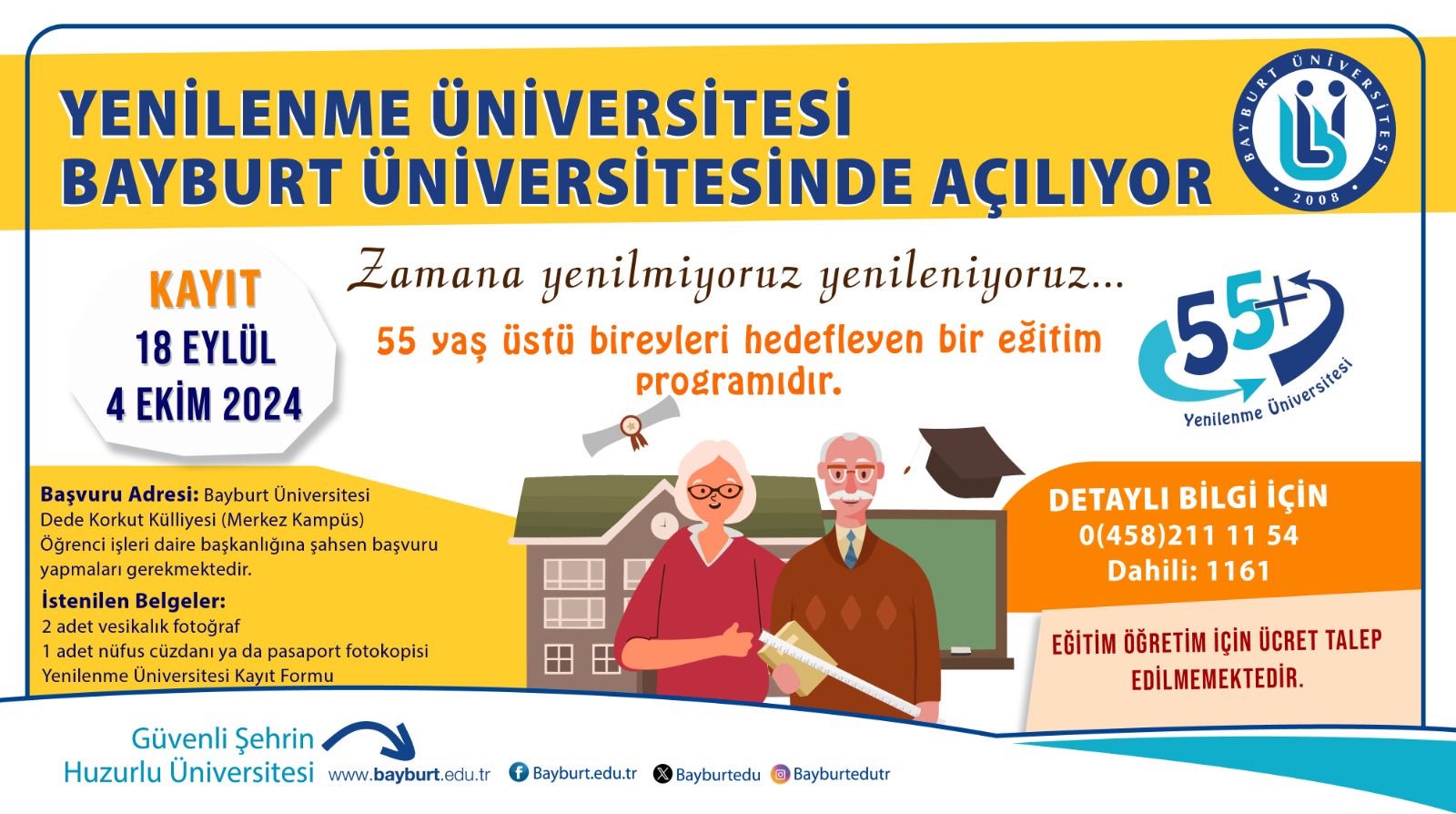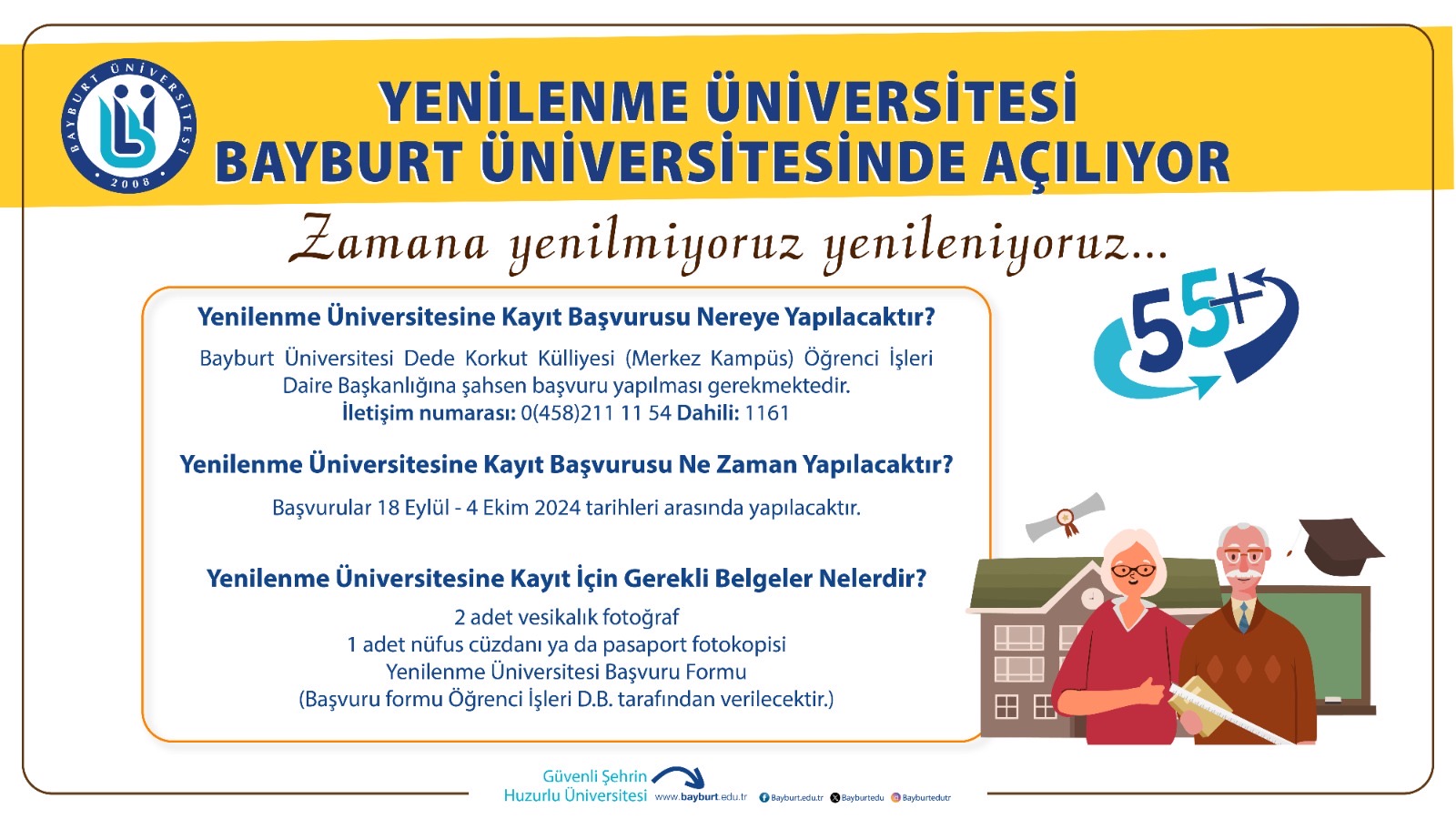 Yenilenme Üniversitesine 55 yaş üstü tüm bireyler, herhangi bir mezuniyet şartı aranmaksızın kayıt yaptırabilir. Kayıt başvuruları, 18 Eylül - 4 Ekim 2024 tarihleri arasında Bayburt Üniversitesi Dede Korkut Külliyesi Öğrenci İşleri Daire Başkanlığı'na şahsen yapılacaktır. Başvuru için 2 adet vesikalık fotoğraf, nüfus cüzdanı veya pasaport fotokopisi ile başvuru formu gereklidir.